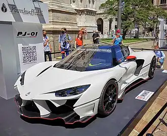 The PJ-01, which has gull-wing doors, was presented at Milano Monza Open-Air Motor Show in June 2021, which was the first edition of the auto show.[1] The production of the sports car is limited to 25 units and is scheduled to begin in Trevi in 2022. Six vehicles are to be built by hand every year. The base price before taxes is 1,500,000 euros. The PJ-01 will also be street legal.[2][3]