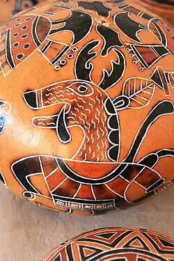 Fineline drawing tradition is common late Moche style. Many iconographic representations have realistic animal and human images in the Moche culture. Paintings portraying deities are most commonly found on ceramic stirrup bottle spouts.[6] Identical motifs of "bird-with-bowl, ritual runners, and deities fighting" can be found at Pampa Grande and Galindo, which is 160 km away.