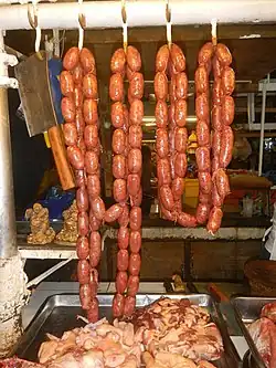 Pampanga longganisa is a Filipino pork sausage originating from the province of Pampanga. It is a type of hamonado (sweet) longganisa. It is typically longer and thinner than other Philippine sausages. It is made with pork, garlic, brown sugar, black pepper, coarse salt, and vinegar. It can be prepared with or without the casing. It is typically dyed orange or red with achuete seeds. It is the most common sweet-type longganisa eaten throughout the Philippines, since it is commercially mass-produced.[1][2][3][4][5]