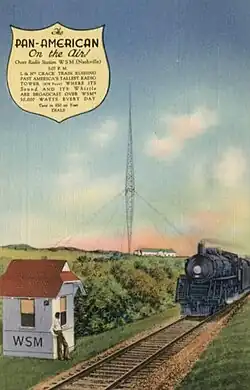 In the words of Kincaid Herr, official historian of the L&N, the Pan-American "came to be the symbol of the L&N's passenger service."[11]: 235 The train was made famous by WSM Radio's nightly broadcast of the passing train's whistle. Some Pan-American passengers were lucky enough to sit in comfortable lounge chairs and hear the sound of their own train's whistle from a wood-cabinet table radio tuned to WSM in the observation car. The broadcasts began on August 15, 1933.[2]: 26 [11]: 259
