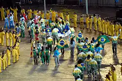 As mandated by the Olympic Charter, various elements frame the opening ceremony of the Pan American Games.[29] The Organizing Committee of each edition has the flexibility to choose the order of the opening ceremony program. But, it has been common since 2007 that the opening ceremonies starts with the nation anthem of the host country and the nations parade is held immediately afterwards, with the athletes grouped by nation. Argentina is traditionally the first nation to enter in order to honor the origins of the Pan American Games, similarly to how Greece enters first in the Olympic Games as the originator. Nations usually then enter the stadium alphabetically according to the host country's or city's official language, with the host country's athletes being the last to enter. During the 1995 Pan American Games, which was hosted in Mar del Plata, Argentina, the Argentine flag entered the stadium first, while the country's delegation entered last (similarly to the 2004 Summer Olympics in Greece) and all delegations could sit in reserved areas in the stands of the main stadium. The speeches are given, formally opening the Games; the PANAM Sports Flag and Olympic Flag are raised and the oaths taken immediately afterwards.[29] The host nation then presents artistic displays of music, singing, dance, and theater representative of its culture and history.[29] The artistic presentations have grown in scale and complexity as successive hosts attempt to provide a ceremony that outlasts its predecessor's in terms of memorability. The opening ceremony of the 2011 Games held in Guadalajara, Mexico, reportedly cost $20 million, with much of the cost incurred in the artistic segment.[30] Finally, the Pan American torch is brought into the stadium and passed on until it reaches the final torch carrier—often a well-known and successful athlete from the host nation—who lights the Pan American Games flame in the stadium's cauldron.[7]