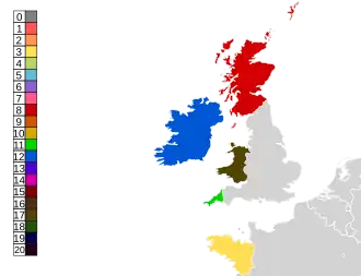 Map showing each Celtic nation's number of Pan Celtic Festival wins (1971–2024)