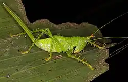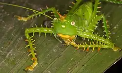 Panacanthus is a genus of conehead katydids found in forests in northwestern South America (western Brazil, Colombia, Ecuador and northern Peru) and Panama, including the western Amazon, the Chocó and the Magdalena River Valley.[2] The common names spiny-headed katydid, spine-headed katydids, spike-headed katydids, thorny devil katydid, thorny devil bush cricket, and similar variations of the sort, do not apply to a single species or to this genus alone, and multiple species are often called by the same common name.