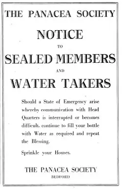 A central purpose of the Society was to persuade 24 Anglican bishops to open Southcott's sealed box of prophecies and, to this end, advertisements were placed in newspapers, both national and local. In the late 1920s and early 1930s the Society generated over 100,000 petitions for the box to be opened.[7] The Society claimed to be in possession of the original box. The Panaceans also believed that the one that was opened in 1927 and found to contain a broken horse pistol and a lottery ticket, was not the genuine box.[8][9]