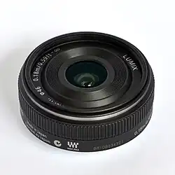 The Panasonic Lumix G 14mm F2.5 lens is a pancake-style prime lens for Micro Four Thirds system cameras. In the Micro Four Thirds format, it is moderately wide. As of its late-2010 release, it is claimed by Panasonic to be the lightest interchangeable digital-camera lens. It is the prime-lens option available with the Panasonic GF2 and GF3, and available separately.