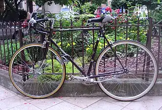 The Panasonic Sport Deluxe utilized Suntour and Shimano group parts such as derailleurs, shifters, and crankset.[1] The Sport Deluxe frame was originally built out of double-butted 1020 high-tensile steel,[2] though bikes produced in later years may have frames of butted chrome molybdenum steel alloy.