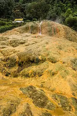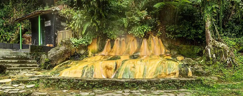 The waters contain sulfur and other minerals, with the sulfur content measuring 230.8 parts per million.[7] As such, the waters are considered to have healing properties by local residents, and the springs are used to treat skin conditions and rheumatism.[3][5] The sulfuric waters of Pancuran Tujuh pour down the slope, and over the centuries have left a mineral deposit.[3]