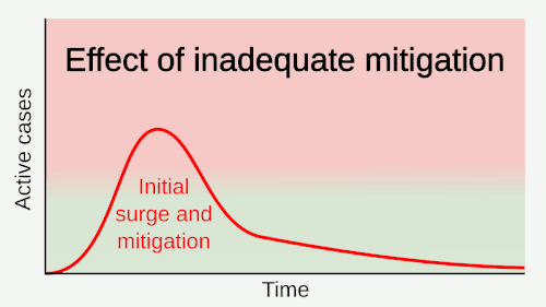 A key part of managing an infectious disease outbreak is trying to decrease the epidemic peak, known as "flattening the curve".[46][49] This helps decrease the risk of health services being overwhelmed and provides more time for a vaccine and treatment to be developed.[46][49] A broad group of non-pharmaceutical interventions may be taken to manage the outbreak.[49] In a flu pandemic, these actions may include personal preventive measures such as hand hygiene, wearing face-masks, and self-quarantine; community measures aimed at social distancing such as closing schools and canceling mass gatherings; community engagement to encourage acceptance and participation in such interventions; and environmental measures such as cleaning of surfaces.[47]