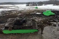 To create personnel with tanks, studio specialists used the old technology of combined shooting-special effect. On the field, full-size wooden models of tanks, covered with green cloth, were used in the field, which the workers moved around the field on a sleigh. Then the surveyors made measurements of the landscape, and Scandinava recreated the battlefield at a scale of 1:16 in the studio and photographed all the scenes with detailed models of tanks, reduced by 16 times. To create a winter atmosphere in the film (snow, blizzard, the sky changing in the film's drama), the consequences of the attacks (smoke, ash), and to amplify gun shots and some explosions, Scandinava decided not to use the traditional approach using CGI (Computer-generated imagery, The letters "computer-generated images"), instead taking real natural effects on the camera. Shooting on the nature, tanks and natural effects were collected by layers on the computer in one single image.