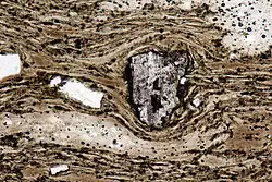 Pantellerite is a type of volcanic rock, specifically a peralkaline rhyolite. It has a higher iron and lower aluminium composition than comendite.[1] It is named after Pantelleria, a volcanic island in the Strait of Sicily and the type location for this rock. On Pantelleria the rock is usually found as a vitrophyre containing phenocrysts of anorthoclase or sanidine. Quartz is found only in the most strongly peralkaline rocks. Mafic minerals may include aegirine, fayalite, aenigmatite, ilmenite, and sodic amphibole (often arfvedsonite or ferrorichterite).[2]