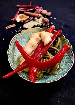 The Sichuan pao cai is commonly made from fresh or salted vegetables like radish, carrot, and cowpea with anaerobic fermentation under ambient temperature based on the microbes present on the raw materials.[8] The microbes are mainly lactic acid bacteria (LAB) which grows preferentially under the fermentation conditions.[8] The raw materials are immersed in brine (a 6–8% salt concentration) seasoned by dressings like ginger, chili, Sichuan pepper, and garlic.[14][8] Local people in Sichuan utilize aged pao cai brine for fermentation. If the aged brine is not spoilage or has no inappropriate odor, it is often reused for many years or even decades.[7] The aged Sichuan pao cai brine can provide great amounts of lactic acid bacteria, which helps it to grow rapidly and become the dominant microorganisms.[7][15]