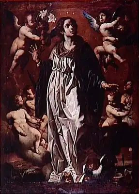 He painted extensively in 1620–1626 in the Certosa di San Martino in Naples. He painted a Baptism of St Celsus (c. 1635) for the Pozzuoli Cathedral. He also painted a number of Immaculate Conceptions, including versions in San Lorenzo Maggiore of Naples; in the Annunziata of Airola; in the church of San Francesco in Montesarchio; and in the Palais des Beaux-Arts in Lille,[1] as well as a Virgin with saints Margaret, Bernard & Anthony of Padua (1634) for the church of Santi Bernardo e Margherita a Fonseca in Naples, and an Annunciation and Bride of the seven canticles for the church of the Annunziata at Airola.