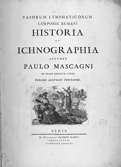 As a young man, Mascagni was interested in geological sciences, as evidenced by his several papers on the Lagoni (thermal springs) of Siena and Volterra. Upon graduation, he turned his interest to the human lymphatic system. His many discoveries in this field led to the composition and publication of Vasorum lymphaticorum corporis humani historia et iconographia in 1787.[2] He was elected a corresponding member of the Royal Swedish Academy of Sciences in 1796, and president of the Accademia dei Fisiocritici in 1798.