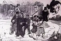 Negovani opposed Greek propaganda and was against marriages with "foreign elements".[3] During 1905, Negovani, in the presence of Bishop Karavangelis[7] conducted the Orthodox Divine Liturgy in the Albanian Tosk dialect.[3][8][9] Karavangelis denounced the usage of Albanian in mass and under his orders had Negovani murdered.[9] The village of Negovani was attacked (12 February 1905) by Greek guerillas (andartes) and Kristo Negovani along with his brother and three other villagers were killed.[10][3][9][11] Negovani's death aroused a nationalist response with the Albanian guerilla band of Bajo Topulli killing the Metropolitan of Korçë, Photios.[11][3][9]
