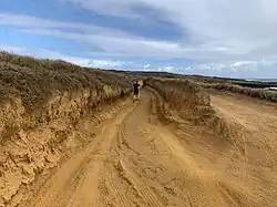 The beach is located about 3 miles (5 km) east of Ka Lae (known as South Point) on the island of Hawaiʻi.[17] It is surrounded by pasturelands and is only legally accessible by foot. The paths are rugged due to both illegal vehicular traffic and erosion. The land owner, the Department of Hawaiian Home Lands,[18] has attempted to restrict vehicular traffic in the area since 2016. However, illegal vehicular traffic has continued despite the measures. The vehicles have created ruts in the soil that reach well over 8 feet deep as shown in the photo below from December 20, 2020.
