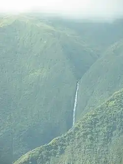 Papalaua Falls is a waterfall on the northern shore of the Hawaiian island of Molokai, in the Papalaua Valley. Fed by the Kawai Nui stream,[1] it flows for 501 m (1,644 ft) and carves out a very steep fissure. It has five drops, and the middle of the falls has a 340 m (1,120 ft) drop that can be seen from the sea, making it popular with aerial or boat tours of the island.[2][3] While it flows all year round, it is especially powerful during the rainy season, from November to March.[4][5][6] The waterfall is commonly misidentified as the nearby Kahiwa Falls.[4] The area surrounding the waterfall still contains remnants of the terraces Native Hawaiians and Chinese used to grow taro.[7] Its name comes from the word pāpala-ua, meaning "rain fog".