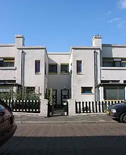 The Papaverhof includes 128 middle-class homes built in horseshoe fashion around a sunken garden. Besides the communal garden in the middle, each home has its own yard with enclosing wooden fence and cement flower pots in matching architectural style.
