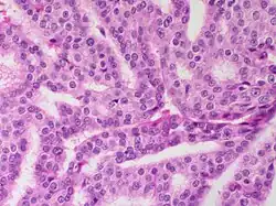 The microscopic histopathology of typical PDCIS lesions (refer to adjacent high-power photomicrograph) prepared with a hematoxylin and eosin stain consists of mammary ducts that have papillary fronds (i.e. thin, finger-like or leaf-like structures) lined with one or several layers of neoplastic, columnar-shaped epithelial cells (i.e. tall, narrow cells with their nuclei close to the site of their ductal attachment).[4] The fronds have branching fibrovascular cores. Epithelial cells lining the fronds' inner surfaces commonly form solid, cribriform (i.e. large nests of cells perforated by many rounded, variably sized spaces), or micro-papillary patterns. There may be a second population of epithelial cells lining the papillae that have abundant clear cytoplasm in addition to the usual neoplastic epithelial cells which line the papillae. These cells, which are not myoepithelial cells, have been termed globoid cells.[7] They have eosinophilic cytoplasm (i.e. pink or red cytoplasm due to its uptake of eosin stain).[6] PDCIS tumors with these cells have been termed dimorphic variants of PDCIS.[3] Myoepithelial cells are typically present at the periphery of the fronds but absent within the involved ducts.[4][7] The presence of a fibrous capsule and/or absence of peripherally located myoepithelial cells are strong indicators that the tumor is an ESP rather than a PDCIS.[3] PDCIS tissues may also contain areas of "Comedo-type necrosis", i.e. areas where dead cells have accumulated.[6]