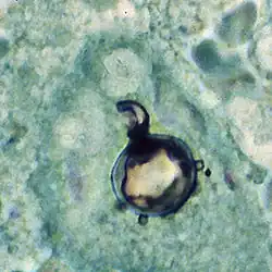 The yeast reproduces by asexual budding, where daughter cells are borne asynchronously at multiple, random positions across the cell surface. Buds begin by layers of cell wall increasing in optical density at a point that eventually gives rise to the daughter cell.[3] Once the bud has expanded, a cleavage plane develops between the nascent cell and the mother cell. Following dehiscence, the bud scar disappears.[8] In tissue, budding occurs inside the granulomatous center of the disease lesion, as visualized by hematoxylin and eosin (H&E) staining of histologic sections.[10] Nonbudding cells measure 5–15 μm in diameter, whereas those with multiple spherical buds measure from 10–20 μm in diameter.[10] In electron microscopy, cells with multiple buds have been found to have peripherally located nuclei and cytoplasm surrounding a large central vacuole.[12] In the tissue form of P. brasiliensis, yeast cells are larger with thinner walls and a narrower bud base than those of the related dimorphic fungus, Blastomyces dermatitidis.[10] The yeast-like form of P. brasiliensis contains multiple nuclei, a porous two-layered nuclear membrane, and a thick cell wall rich in fibers, whereas the mycelial phase has thinner cell walls with a thin, electron-dense outer layer.[8]