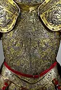 The Parade Armour of Henry II of France, now in the Metropolitan Museum of Art, New York, is believed to date from c 1553–55 and its decoration is attributed to the French goldsmith and engraver Étienne Delaune. Designed for use in pageantry, the armour was fashioned of gold, silver and steel and with leather and red velvet trimmings.[1] It was created for Henry II of France as ceremonial wear; the figures embossed on the breastplate and back are intended to reflect his military achievements.