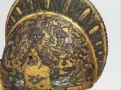 Parade armour became an elaborate and ornate Renaissance art form intended to both glorify war and flatter the military prowess of the royal subject. Surviving examples include decorated shields, helmets, and full suits of armour.[5] Delaune was an important contributor to the form, and Henry II commissioned a number of similar works, including a panel for his horse, and some bucklers (shields) now in the Louvre, both by Delaune. In addition surviving works for Henry include a full suit at the Museum of Ethnology, Vienna.[6]