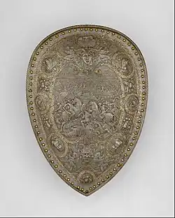 Henry required armour for battle, tournament and state occasions, and kept a court armoury staffed by mostly French, Flemish and Italian artisans, of whom Delaune was probably the most skilled and was called upon for the most prestigious commissions.[7] The c 1555 "Shield of Henry II of France" also in the Metropolitan, is thought to have been based on a design by Delaune.[8] Today there are at least six surviving examples of armour designed for Henry by Delaune, a number of which are shields, including in the Wallace Collection, Vienna, and Turin.[6]