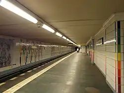 The station was designed by Alfred Grenander and was originally sandy-coloured.[12] Around 1992, it was retiled in small white tiles with multicoloured accents representing the colours of all the Berlin U-Bahn lines, making it one of the most colourful stations in the system.[2]