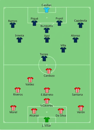- ^ a b "Tactical Line-up – Quarterfinal – Paraguay-Spain" (PDF). FIFA.com. Fédération Internationale de Football Association. 3 July 2010. Archived from the original (PDF) on November 9, 2012. Retrieved 3 July 2010.