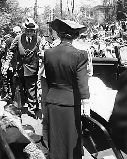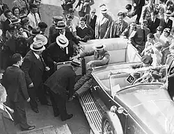Roosevelt exiting a car during a campaign trip to Hollywood, California (1932)
