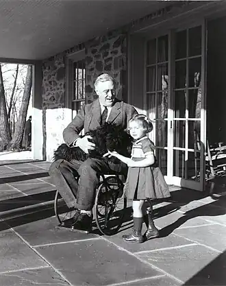 Rare photograph of Roosevelt in a wheelchair, with Ruthie Bie and Fala (1941)