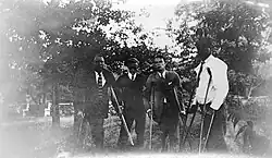 Roosevelt supporting himself on crutches at Springwood in Hyde Park, New York, with visitors including Al Smith (1924)