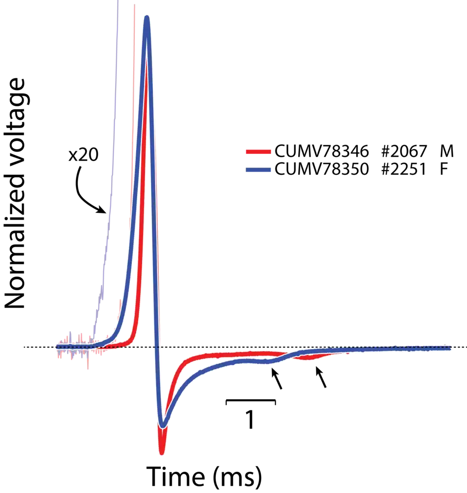 Paramormyrops hopkinsi is a species of freshwater electric fish. It was discovered in the Ivindo River in Gabon, in west-Central Africa by Dr. Carl D. Hopkins of Cornell University.[1][3][4] It is distributed throughout the Ivindo River basin of Gabon and the Ntem River basin of Cameroon.[2] Described originally as a Brienomyrus in 1985[1] it was transferred to Paramormyrops in 2007.[5] The electric discharge has two phases: a head-positive phase followed by a head-negative phase. The mean duration of the EOD is 2.8 ms for females, 2.96 for males. The Fourier transform of the EOD peaks at 536 Hz for females, 468 for males. Both male and female EODs have a head-negative voltage bump about 5 to 6 ms after the main head positive phase (arrows).
