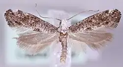 The wingspan is 10–13 mm. Adults are greyish with a white head and thorax. Thorax white, sometimes anteriorly fuscous-sprinkled. Forewings white, irregularly irrorated with fuscous; some longitudinal series of blackish dots; antemedian dark fuscous fascia reduced to two spots, discal and dorsal; two white spots on costa posteriorly, separated by a dark fuscous spot; cilia coppery-tinged, with two dark purplish-fuscous lines. Hindwings pale fuscous. Larva reddish-brown; dorsal line broad, paler, becoming indistinct posteriorly; spiracular broad, yellowish-white; head pale yellow-ochreous.[3]