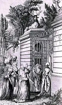A Parc-aux-Cerfs ([paʁk.o.sɛʁ]; "park of stags"), in France, was generally the name given to the clearings that provided hunting fields for the French aristocracy prior to the French Revolution.[1] The name is most notoriously known in history for an area in the grounds of the Palace of Versailles and a house there owned by Louis XV, where his secret mistresses were accommodated, being taken from there to the palace to visit the king.