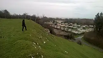 Bryn Ddiôl is a plateau some 95 metres above sea level, the eastern termination of an outcrop of Carboniferous limestone. On three sides it is surrounded by natural cliffs and steep slopes (and, in 2016, by extensive modern caravan sites, Parciau farmstead, and other buildings). It is some 2 km from beaches on the northwest coast of the island, commanding extensive sea views beyond them.[3] To the west the ground offers a gentle slope for access, and here the tip of the outcrop is cut off by at least one outer wall, through which the entry point is still visible.[4] The base of a small gate-house adjoins the entrance.[3] The wall continues around the outcrop, defining a protected area some 110 by 80 metres.