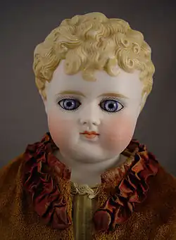 "Parian" is a term misapplied to a type of bisque shoulder head dolls manufactured primarily in Germany in the last quarter of the 19th century, from around 1860 to 1880. The origin of the term "parian" comes from the white marble from the island of Paros. The proper descriptive term for these dolls is "bisque". These shoulder head dolls have a body made from fabrics and a head created from very lightly tinted or untinted white porcelain. Unlike the china doll however, the bisque doll's head is not dipped in glaze before firing and as such has a matte finish, giving it a markedly different appearance. The UFDC (United Federation of Doll Clubs) still perpetuates the incorrect definition of these dolls is as follows: "Parian doll: doll made of fine white bisque (unglazed porcelain) without tinting. The features, hair and cheeks may be painted."[1] Many collectors now are discarding the term parian in favor of untinted bisque versus tinted bisque.