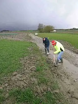 The Amis de Paris–Roubaix spend €10–15,000 a year on restoring and rebuilding cobbles. The Amis supply the sand and other material and the repairs are made as training by students from horticulture schools at Dunkirk, Lomme, Raismes and Douai. Each section costs €4–6,000, paid for equally by the Amis, the organisers and the local commune.[27] Bernard said: