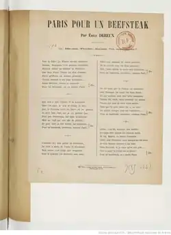 Paris pour un beefsteak is a song written during and about the siege of Paris (1870–71), on 15 October 1870, by Émile Deureux, in Blanqui's journal La Patrie en danger[1] using the music of Te souviens-tu? originally composed by Joseph-Denis Doche.