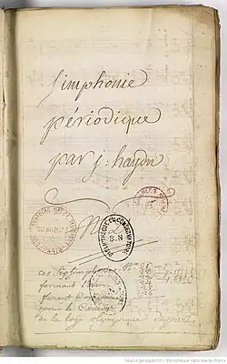 According to the composer Giuseppe Maria Cambini,[5] who participated in the orchestra, the finest musicians in Paris performed in the premieres of the symphonies, and received them with "rapture". Edited by Saint-Georges, the symphonies were published in Paris by Sieber.[6] The works were very popular with public and press, and were soon published in London and Vienna. Haydn's very good friend Mozart called them "concert essentials".