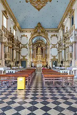The painting on the ceiling of the nave is the work of José Teófilo de Jesus, completed in 1837. The master woodcarver Joaquim Francisco de Matos completed talha work on four altars of the nave, six tribunes, two pulpits, the carvings of the choir, and carvings of the baptismal font. The works were contracted in 1838 and completed in the following year; they were ultimately gilded in 1848.[9][3]