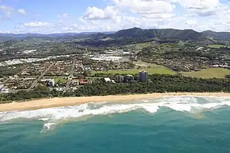 Park Beach is home to the largest shopping centre between Newcastle and the Gold Coast, Park Beach Plaza.[9] Other important places in the area include Park Beach Homebase,[10] Northside Shopping Centre, the Park Beach Holiday Park,[11] Park Beach Bowling Club,[12] York Street Playing Fields,[13] Pacific Towers,[14] the Coffs Harbour Surf Life Saving Club[15] and the Hoey Moey.[16] The Coffs Harbour Food and Wine Festival was formerly held annually at the southern end of Park Beach (Park Beach Reserve), on the edge of Coffs Creek.[5][17]