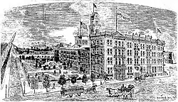 In its initial operation, the hotel was owned by Fred Michel and managed by Rush Field.[12] By May 17, 1879, the hotel was placed in receivership, though it was stated that the hotel would not close.[13] Michel arranged a banquet, later changed to a "grand military prize drill and brass band tournament", to raise funds, dispose of his real estate holdings, and adjust his and the hotel's financial matters. It was to be held on September 16–18, 1879.[14] By late October, a premature statement was made that the hotel would close, though a correction indicated the owners would make changes yet keep it open.[15] In November 1879, furniture and fixtures from the hotel were sold at auction.[16][17] In 1880, Michel proposed renting the vacant hotel at a nominal rate to the government for temporary use, and he offered to donate the park space he owned west of the hotel for a new federal courthouse.[18]
