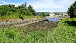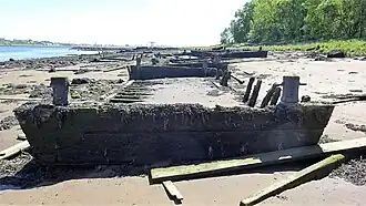 The OS map of Renfrewshire in 1864 shows a wide jetty with a flagstaff and a small building on the western side. It appears to have extended into the river as far as the low water mark, but the shoreline has altered considerably over the years due to dredging, building of training dikes, jetties, etc.[22] Between 1864 and 1895 a dock or basin was built also extending into the Clyde towards the low water mark. The jetty is portrayed as if it was damaged by erosion, floods, etc and a repair effected using wooden piles that are still visible.[3] The eastern jetty in 1857 had a possible crane and a partly curved and strengthened end.[23] In the 1920s or 30s the jetty terminus appears to have been altered and given a straight sided profile.[3] In 1905 the quay seems to still have been in use given that it's marked as such and a beacon stood near by on the upstream direction, possibly on the circular stone structure that once stood in that location.[24] In 1939 the quay was not marked as disused, unlike the abandoned Rashielee Quay, and the repaired eastern dock wall is shown as a linear structure and the terminus of the jetty is linear.[25] Rashielee Quarry and its quay stood near by and provided much of the whinstone used in the construction of quays, jetties, training walls, etc on this part of the Clyde.