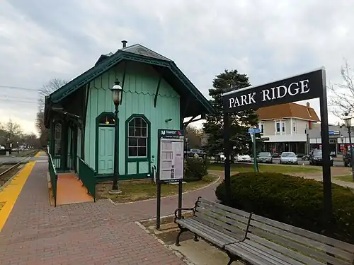 Park Ridge is an active commuter railroad station in the borough of Park Ridge, Bergen County, New Jersey. Located at the intersection of Park and Hawthorne Avenues, the station services trains on the Pascack Valley Line, which runs from Hoboken Terminal to Spring Valley station in New York. The station contains a single low-level side platform split by Park Avenue (County Route 92) and a wooden station depot, built by the Hackensack and New York Extension Railroad. As a result, Park Ridge station is not handicap accessible under the Americans with Disabilities Act of 1990.