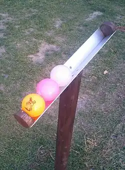 Park golf balls are used in the sport of park golf. They have a weight less than 100 grams (3.5 oz) and diameter of 60 millimetres (2.4 in) and are constructed of durable synthetic resins. They may be translucent or opaque and are manufactured in many different colours. Balls from different manufacturers vary significantly in the way they perform contacting the club, flying through the air and rolling on the grass.