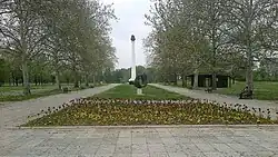 The Avenue of Peace with the memorial obelisk "Eternal Flame" [6] is located in the central part of the park. The park features a flower statue of the sculptor Lidija Mišić. Peace Avenue with 25 plane trees that were planted by statesmen, during a conference of the NAM in Belgrade until 1989, is 180 m long, which also represents the number of countries which had a commitment to peace as their political priority, through the so-called policy of peaceful, active coexistence. All participants of the First Conference planted the same plant – plane tree. The selection of plane trees is their longevity, which emphasizes the idea of establishing a lasting peace in the world. Next to each planted tree is a tablet with the name of the statesman and the country of origin, year of planting, and the denomination of the tree Platanus acerofilia. Plane tree seedlings are placed at a distance of eight meters so that they could merge at a certain height of their growth and thus form a unique green series which also symbolizes of the connection of all nations through a common idea. From the competition solution to today, only 9.5 hectares of park area have been realized. Although little has been done out of the original idea of the architect Pališaški,[7] specificity in the formation of a modern park is basically considered even today.[8]