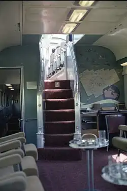 An initial proposal for each car to have its own decorative scheme was rejected on cost ground; instead there were two schemes: "O" and "P"; both of which were developed by Harbeson, Hough, Livingston and Larson, a firm of architects in Philadelphia frequently used by Budd.[4] Additionally, a leading Canadian artist was commissioned to produce two murals for the beverage room: a main mural 81+3⁄8 by 41 in (2,070 by 1,040 mm) for the front wall, and an auxiliary mural 163 by 45 in (4,100 by 1,100 mm) for the right hand (window-side) wall.[5] In addition, they were asked to provide a 3 by 5 ft (0.91 by 1.52 m) decorative map for the observation lounge which was mounted above the writing desk to the right of the dome staircase. Both related to the Park the car was named after. At the time of their construction in 1954 the listed capacity throughout the car was 54 persons.[1] Via removed the murals in 1986.[6] Via rebuilt the cars in the early 1990s, converting them to Head End Power (HEP), and renumbering them into the 8700-series. They also added a panel of clocks to the observation lounge showing the different time zones in Canada.[7]