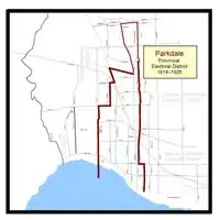 Redistribution gave Parkdale some of the area that was previously part of the Brockton electoral district. It also relinquished all the area north of Bloor Street West. The northern border was a straight line from approximately Clendenan Avenue straight to Brock Avenue. The boundary then went south along Brock Avenue to Queen Street West. It went east again, along the south side of Queen until Elm Grove Avenue. It went south along Elm Grove until King Street West. At King Street West, it went west along King's north side until Spencer Avenue. The boundary then moved south along Spencer's western side all the way to the southern boundary, Lake Ontario. The western boundary on land started at the city limits on the west side of High Park. It went straight along the City Limits until it again met Bloor Street West at approximately Clendenan Avenue/Wendigo Way.[3]
