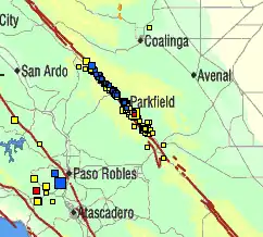 Parkfield earthquake is a name given to various large earthquakes that occurred in the vicinity of the town of Parkfield, California, United States. The San Andreas fault runs through this town, and six successive magnitude 6 earthquakes occurred on the fault at unusually regular intervals, between 12 and 32 years apart (with an average of every 22 years), between 1857 and 1966.[1] The latest major earthquake in the region struck on September 28, 2004.
