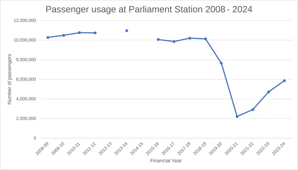 Parliament is one of the three underground stations on the City Loop. As of 2023-24 it carries 5.863 million passengers per year, making it the fourth-busiest station on the metropolitan network,[2] approximately half of its usage prior to the COVID-19 Pandemic.[4][5]
